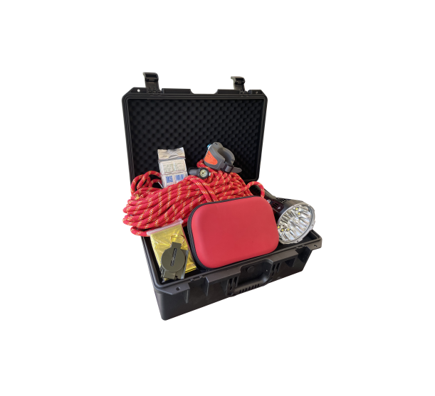 这是一款针对在极端环境里救援使用而研发的便携式应急救援套装,整套装备由水陆两用便携破玻器(含CO2气瓶,质量294.8g)、救生护腕(含CO2气瓶)、医疗急救包(含主要成分为壳聚糖止血颗粒的止血粉)、救护包、高频求生哨、充饥应急压缩饼干(200g,保质期36个月)、高亮泛光手电、水面漂浮救生绳、防水应急保温毯(210cm×160cm,重量:65g)、防水单兵指南针(材质为铝、金属及玻璃)等组成。所有装备应整体装入ABS防水携行箱内并分别合理安置,便于紧急情况下迅速准确取用。